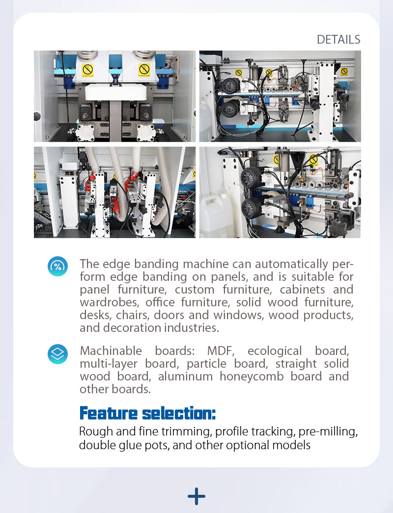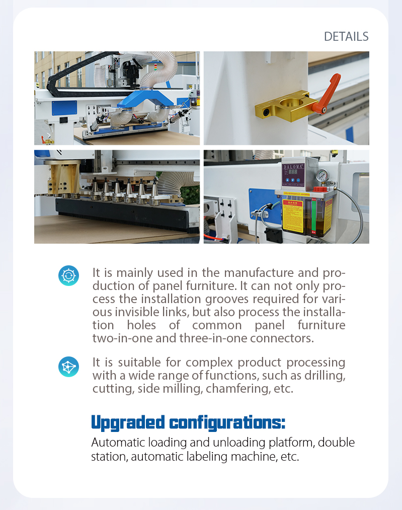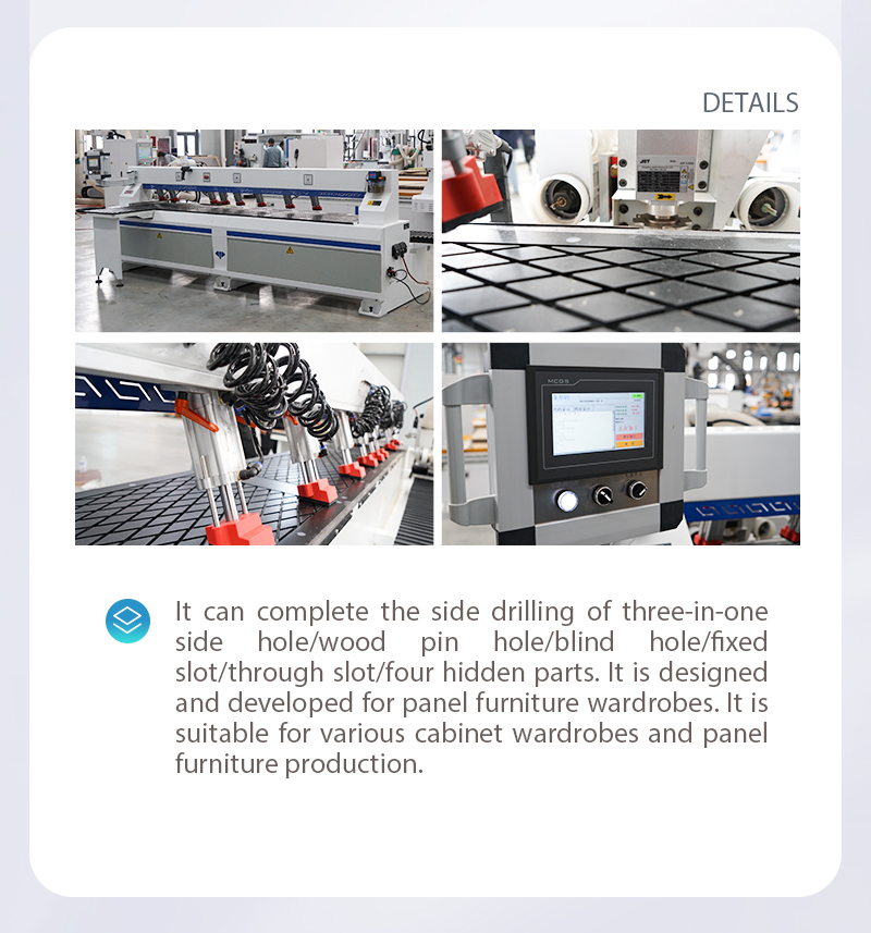 Meet the processing needs of furniture manufacturers for non-porous furniture (connected by invisible connectors), panel furniture (using two-in-one, three-in-one connectors) and ordinary panel furniture.