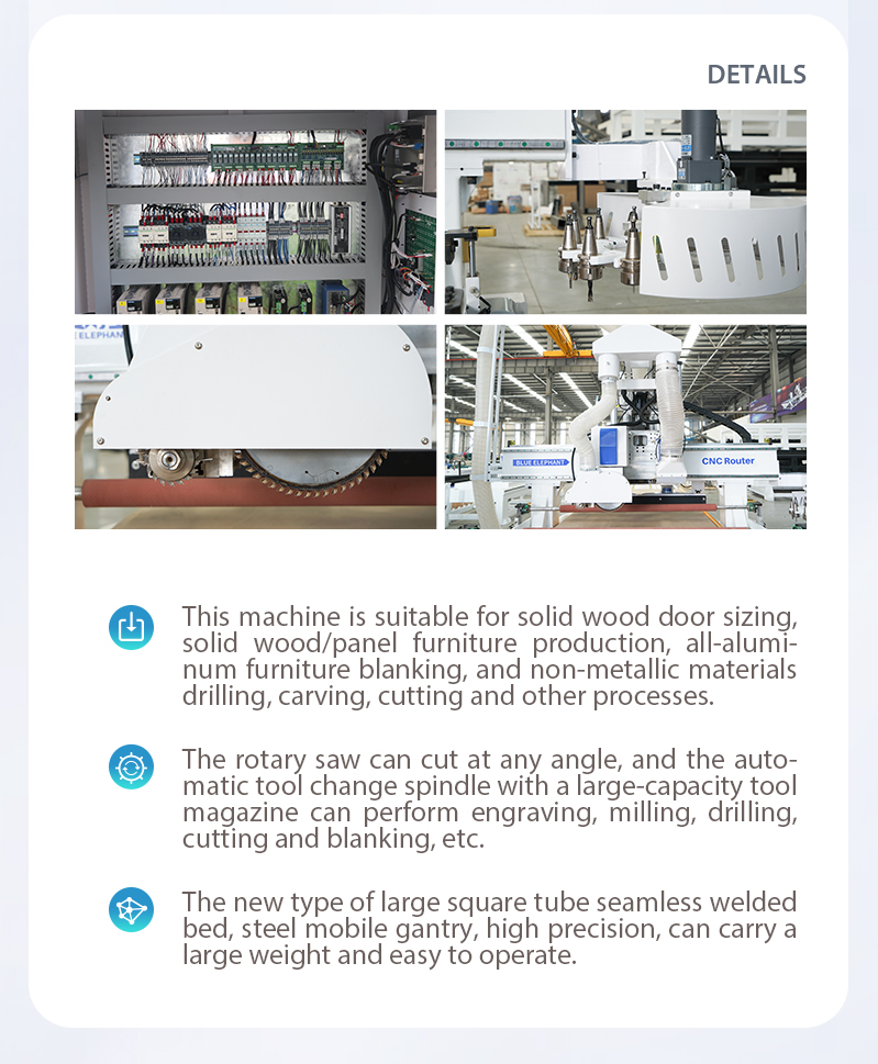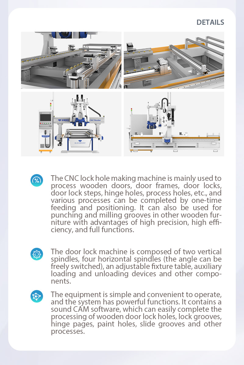 Numerical control machining center of mother and daughter saw and CNC keyhole machine can complete the production and processing of various hollow slots such as solid wood door square, carving, hinge hole, keyhole and so on.